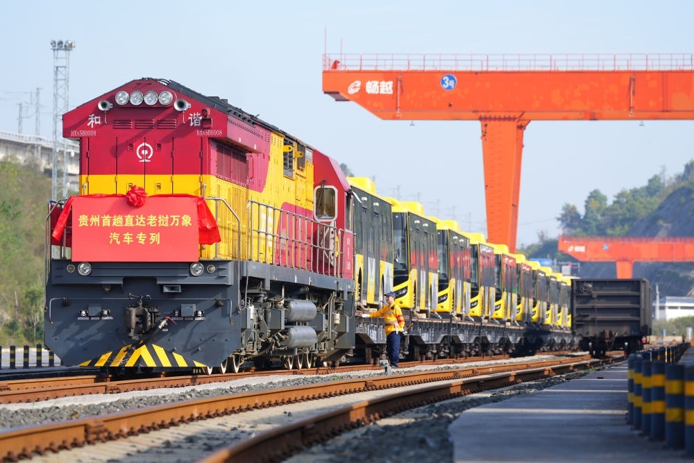 2024年10月28日,裝載著28輛“貴州造”新能源客車的出口專列停靠在貴陽國際陸港都拉營站,準(zhǔn)備經(jīng)由云南磨憨口岸出境前往老撾萬象。這是貴州的中老班列首次整列直發(fā),也是貴州本土生產(chǎn)的新能源客車首次出口老撾。