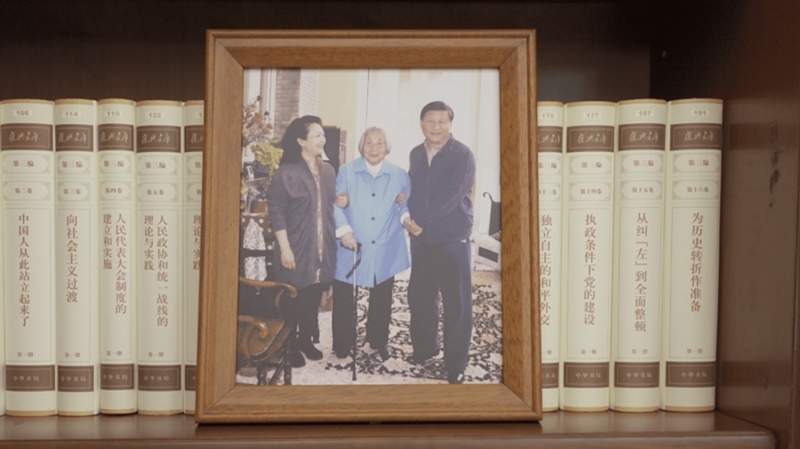 △ 習(xí)近平辦公室的書架上放著一張照片,照片中他和愛人彭麗媛攙扶著母親。