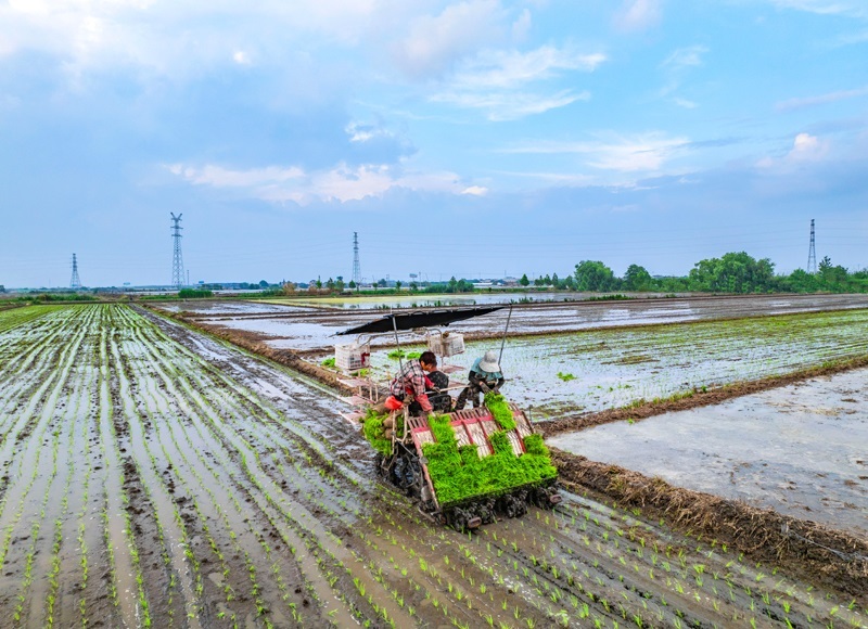 6月14日,在江蘇里下河地區(qū)農(nóng)科所(揚(yáng)州市農(nóng)科院),農(nóng)民在田里起秧、運(yùn)秧(無(wú)人機(jī)照片)。