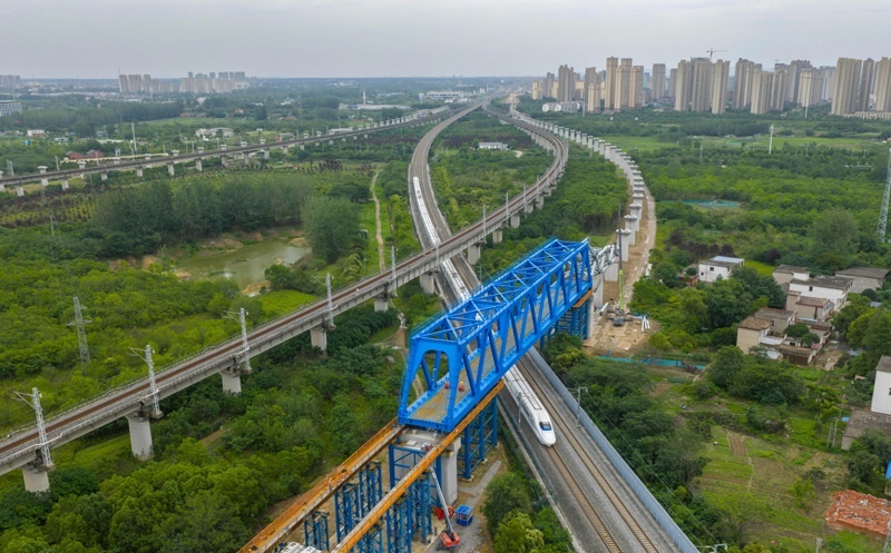 新建滬寧合高鐵鋼桁梁跨越滬蓉鐵路(6月15日攝,無人機照片)。