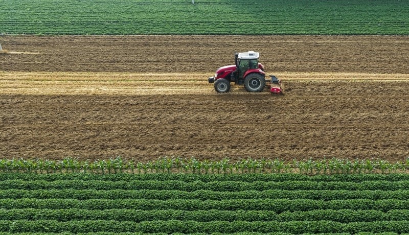 6月19日,河北省遵化市東新莊鎮(zhèn)農(nóng)民駕駛農(nóng)機(jī)旋耕土地(無人機(jī)照片)。