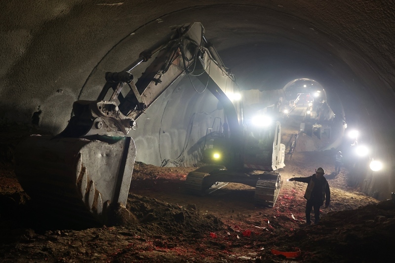 6月29日,工人在已經(jīng)貫通的西成鐵路西科隧道內(nèi)施工。