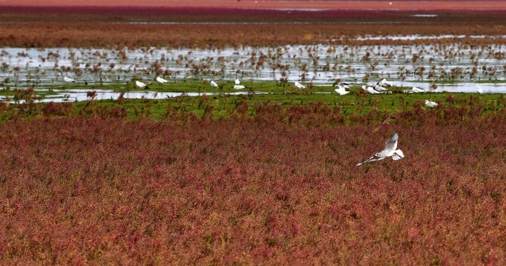 2024年9月14日,海鳥(niǎo)在遼寧省錦州市凌海市紅海灘國(guó)家風(fēng)景廊道紅海灘上空飛翔。新華社記者 錢(qián)一 攝