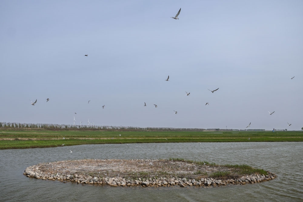 2025年5月8日,鳥(niǎo)類在錦州市大凌河口修復(fù)的濕地內(nèi)棲息、飛翔。新華社記者 潘昱龍 攝