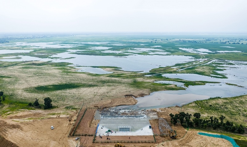 6月30日拍攝的引綽濟(jì)遼工程通遼市莫力廟水庫出水口(無人機(jī)照片)。