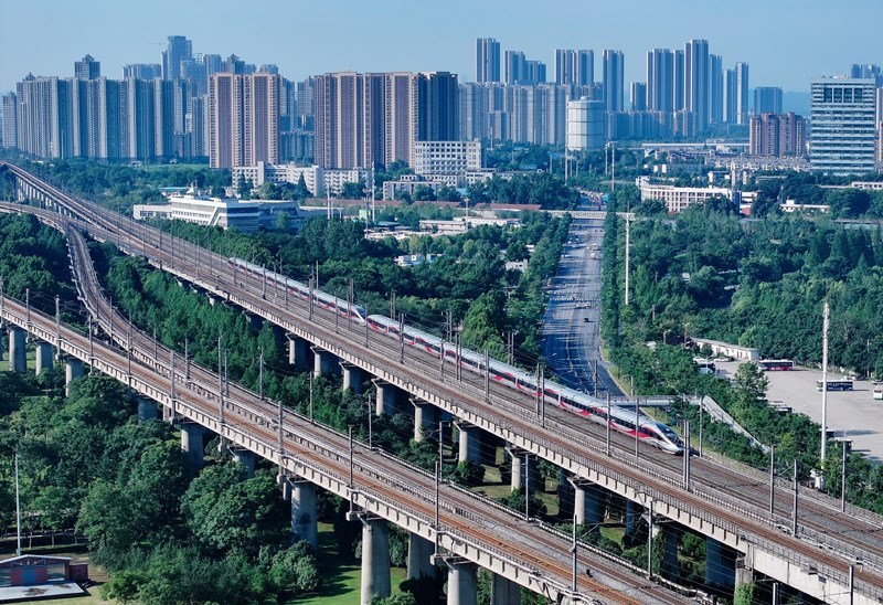 6月30日,一列動(dòng)車(chē)組列車(chē)在浙江省杭州市境內(nèi)行駛(無(wú)人機(jī)照片)。
