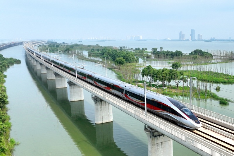 6月30日,一列動(dòng)車(chē)組列車(chē)經(jīng)過(guò)武漢天興洲大橋延長(zhǎng)線(xiàn)(無(wú)人機(jī)照片)。