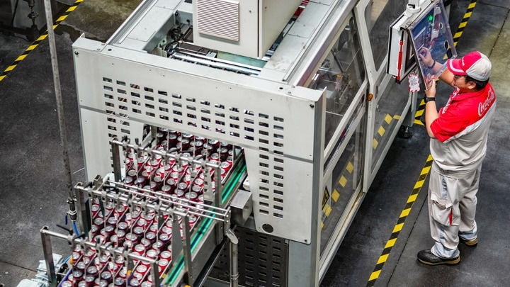 中糧可口可樂飲料(貴州)有限公司的工作人員在生產(chǎn)線旁進(jìn)行操作(2025年8月24日攝)。新華社記者 陶亮 攝