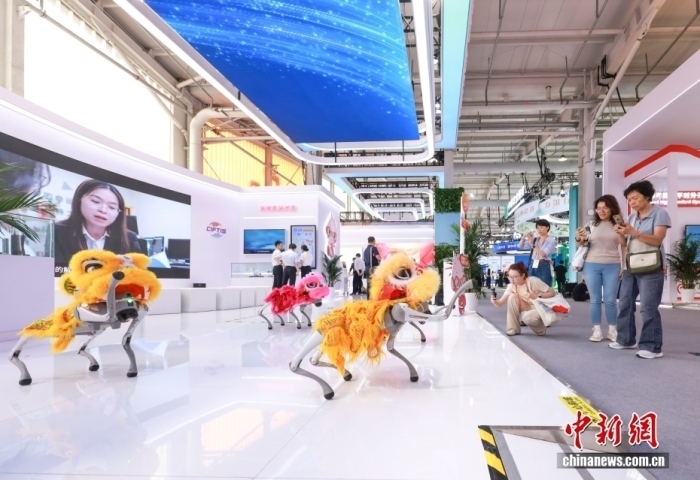 9月10日,2025年中國(guó)國(guó)際服務(wù)貿(mào)易交易會(huì)在北京首鋼園開幕。圖為觀眾參觀機(jī)器狗群舞表演。中新社記者 賈天勇 攝
