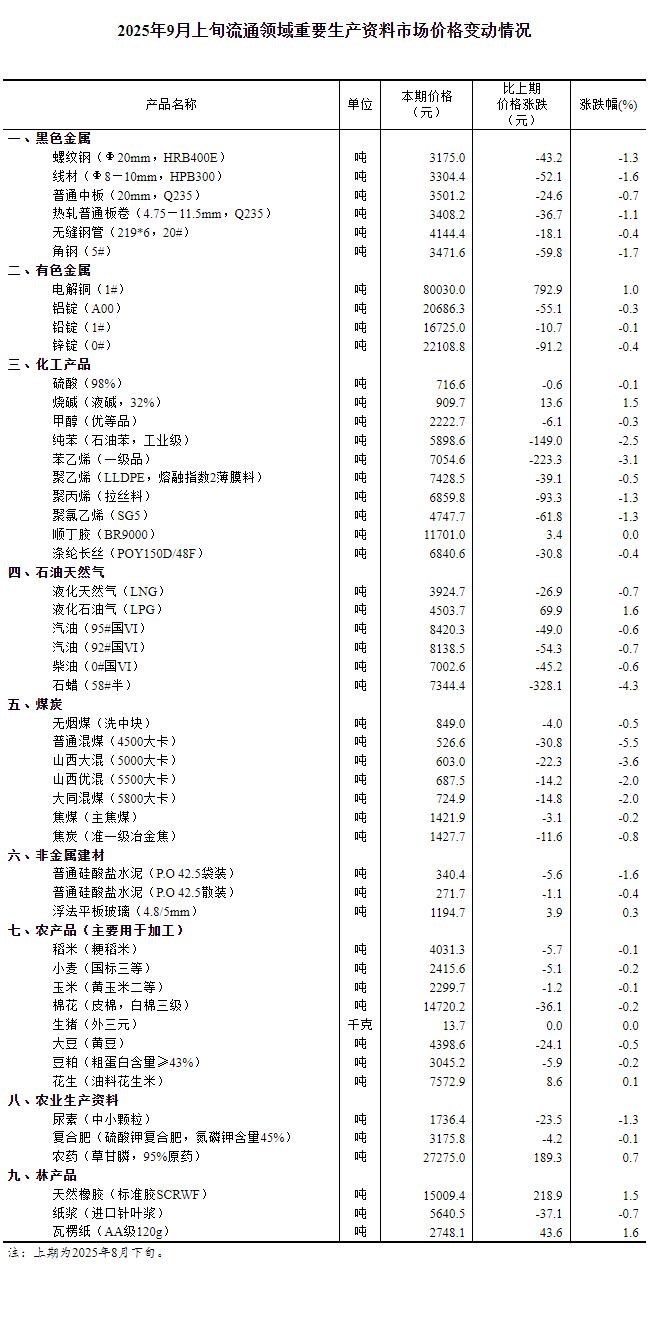 據(jù)國家統(tǒng)計(jì)局網(wǎng)站消息,國家統(tǒng)計(jì)局14日公布2025年9月上旬流通領(lǐng)域重要生產(chǎn)資料市場價(jià)格變動(dòng)情況。