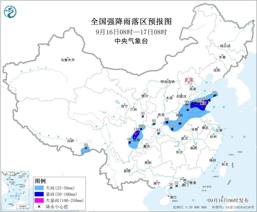 預(yù)計(jì),9月16日8時(shí)至17日8時(shí),四川盆地中西部、甘肅南部、河南中東部、山東中南部以及蘇皖北部等地部分地區(qū)有大到暴雨,其中,山東中南部、四川盆地北部等地部分地區(qū)有大暴雨(100~180毫米)。上述部分地區(qū)伴有短時(shí)強(qiáng)降水(最大小時(shí)降雨量20~50毫米,局地可超過70毫米),局地有雷暴大風(fēng)等強(qiáng)對(duì)流天氣。