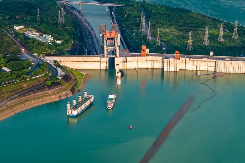 7月1日,在湖北宜昌,船舶有序通過三峽雙線五級船閘和升船機(無人機照片)。
