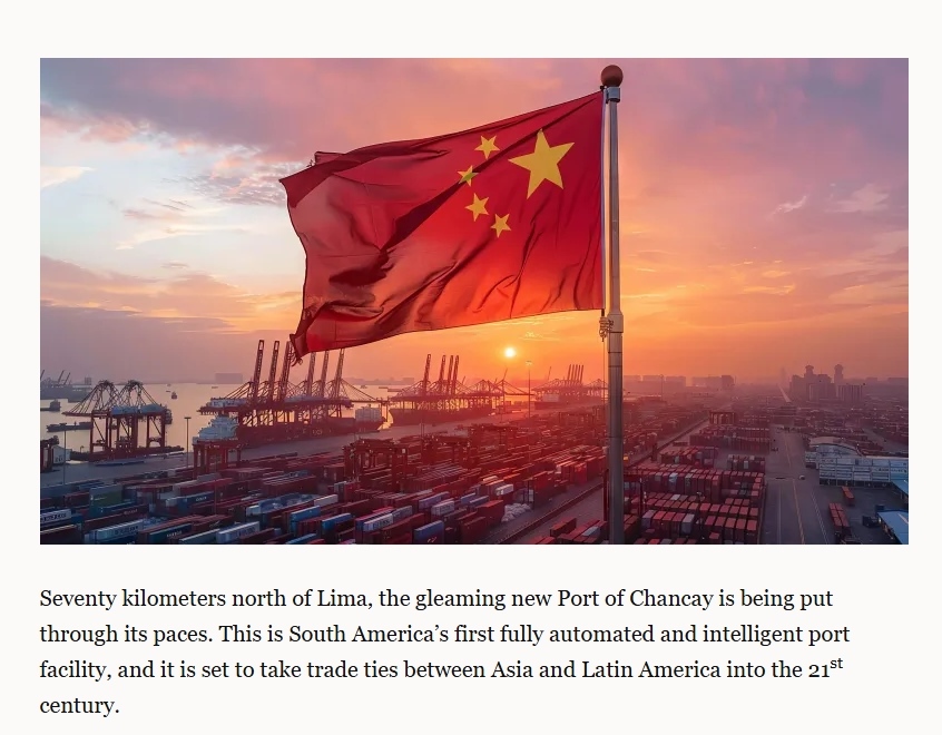 文章首先將目光投向在秘魯首都利馬以北70公里處的錢凱港。這個由中國和秘魯合作建設的嶄新港口,是南美洲首個全自動智能化港口設施,它將把亞洲與拉丁美洲的貿易關系帶入21世紀。隨著通往該港口的跨大陸公路和鐵路連接完工,錢凱港不僅要處理涉及南美洲太平洋沿岸的進出口貨物,也將處理從阿根廷、巴西和巴拉圭穿越太平洋運往中國的牛肉、大豆和小麥等貨物。