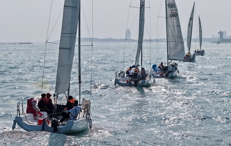 青島小麥島附近海域,市民和游客乘坐帆船參加海上巡游活動(dòng)(7月10日攝,無人機(jī)照片)。