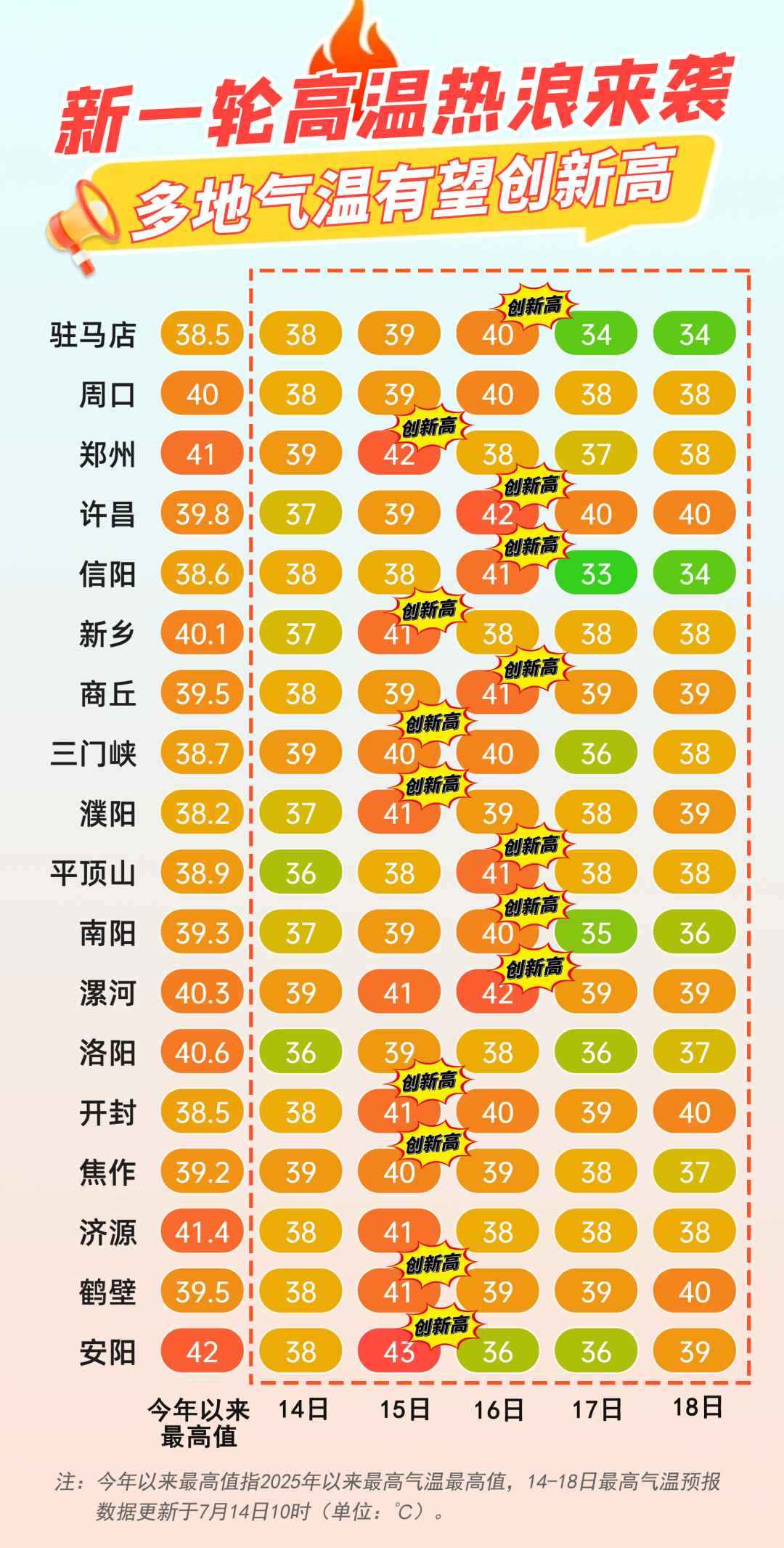 昨日(14日),河南多地氣溫沖破40℃,省、市兩級氣象臺相繼拉響最高級別的高溫紅色預(yù)警。據(jù)省氣象臺數(shù)據(jù),當(dāng)天全省共發(fā)布128條高溫預(yù)警,71個縣市氣溫高于40℃。