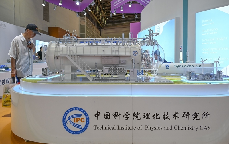 7月17日在先進制造鏈展區(qū)創(chuàng)新鏈專區(qū)拍攝的中國科學院理化技術(shù)研究所自主研制的國內(nèi)首套5噸/天氫液化器模型。