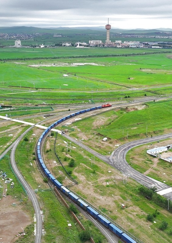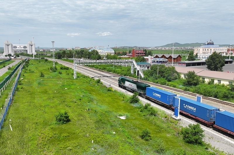 7月24日,一列滿載貨物的中歐班列從中國鐵路哈爾濱局集團有限公司滿洲里站駛出國門(無人機照片)。