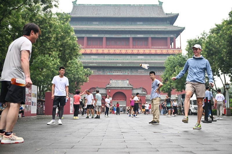 7月27日,人們在活動舉辦地北京鐘鼓樓廣場上踢毽子。