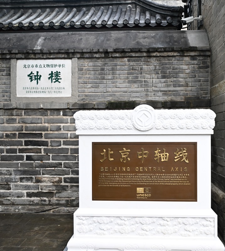 這是7月27日在北京鐘樓前拍攝的北京中軸線世界文化遺產(chǎn)標志碑。