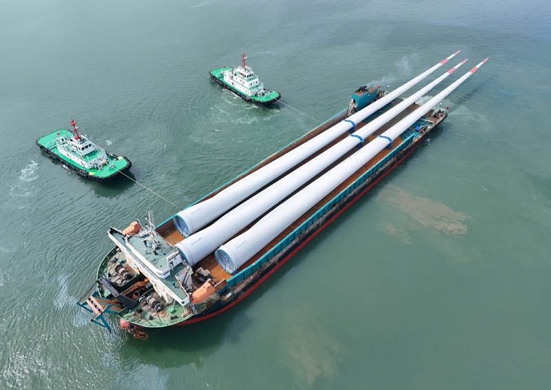 8月1日,超大尺寸海上風(fēng)電葉片從山東港口煙臺港蓬萊港區(qū)起運(無人機照片)。