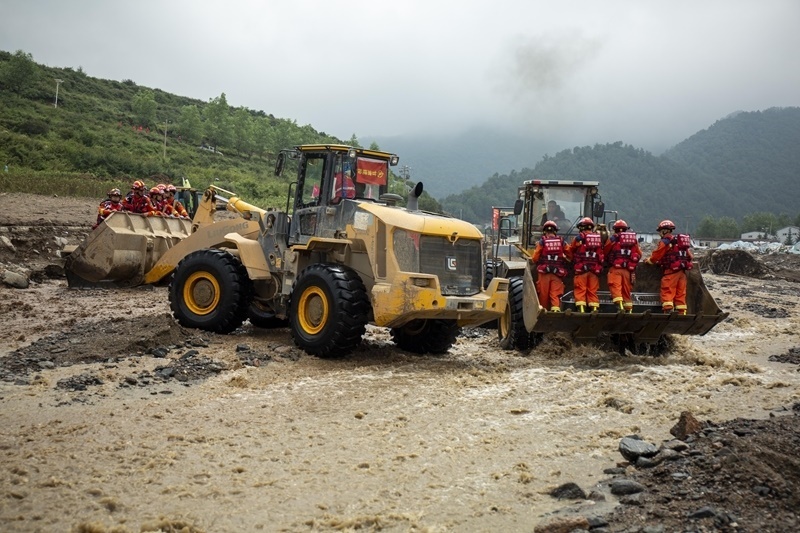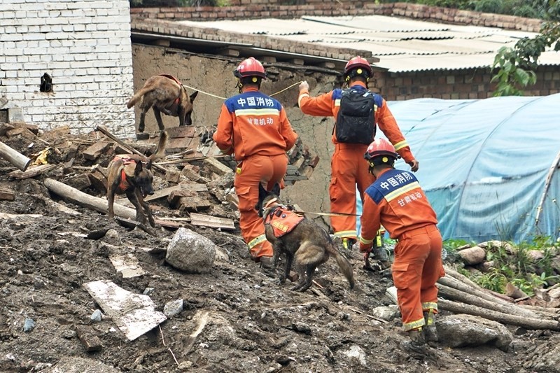 8月9日,國家西北區(qū)域應急救援中心指戰(zhàn)員在馬坡鄉(xiāng)舊莊溝村攜帶搜救犬配合大型機械搜救失聯(lián)人員。