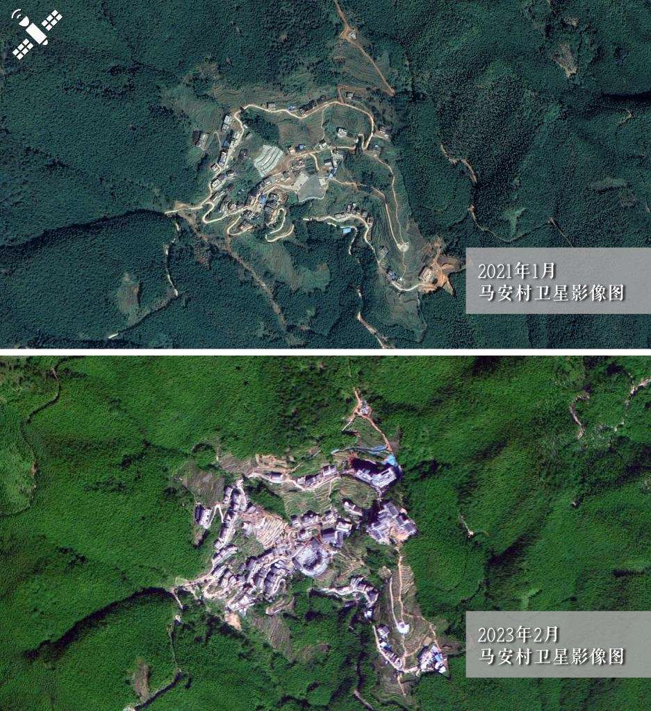 解讀:2021年1月村落原貌(上圖)對(duì)比2023年2月新貌(下圖),馬安村文旅建筑群規(guī)模顯現(xiàn)。
