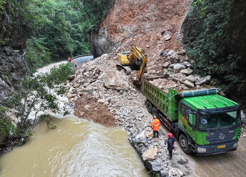 8月10日,在??悼h馬橋鎮(zhèn)堯(治河村)馬(橋鎮(zhèn))路6.2公里處,大型工程機(jī)械處置路旁崩塌的巖石。