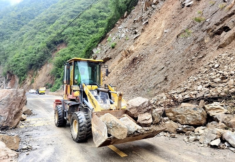 8月10日,在468省道??悼h寺坪鎮(zhèn)升石坪路段,公路養(yǎng)護(hù)部門工作人員駕駛裝載機(jī)處置路旁垮方。