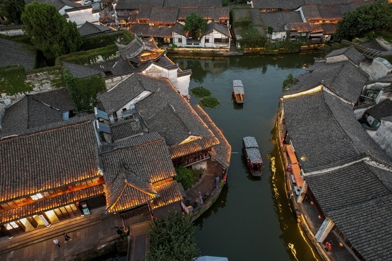8月9日傍晚,游客在浙江省湖州市德清縣新市古鎮(zhèn)游玩(無人機照片)。