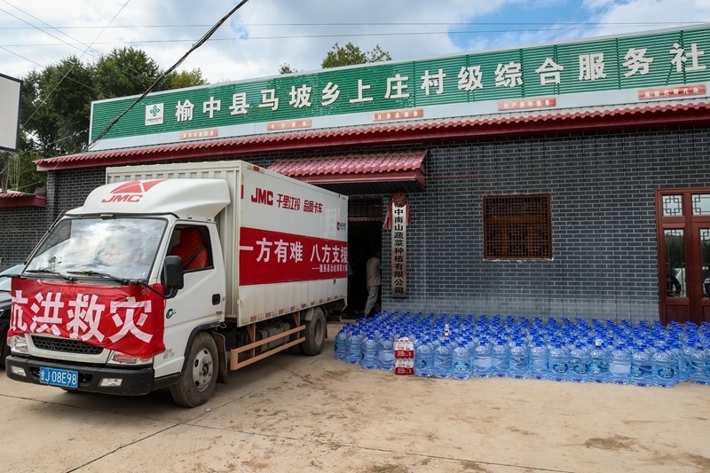 8月10日,一輛載著救援物資的車輛停靠在榆中縣馬坡鄉(xiāng)上莊村臨時安置點。