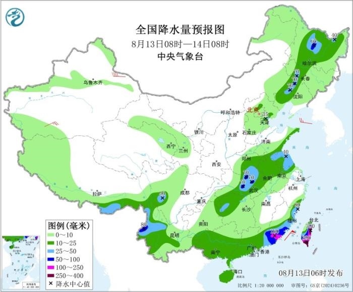 8月13日08時(shí)至14日08時(shí),黑龍江中部、吉林西部、遼寧西部、河南南部、湖北中部、江蘇北部、云南西部、廣東東部、福建東部和南部、西藏南部、臺灣島大部等地部分地區(qū)有大到暴雨,其中,福建東南部、廣東東南部、臺灣島東部和南部等地部分地區(qū)有大暴雨,臺灣島東部和南部等地局地特大暴雨(250~390毫米)。臺灣以東洋面有12~13級風(fēng),陣風(fēng)14~15級;臺灣海峽、巴士海峽有10~11級風(fēng),陣風(fēng)12~13級。