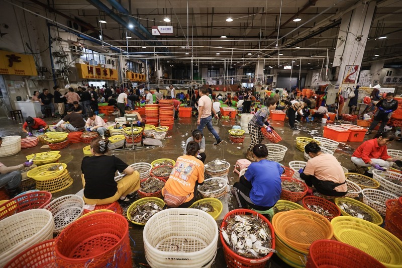 8月12日,商家在舟山沈家門舟山國際水產城內分揀、綁扎當天到港的梭子蟹。