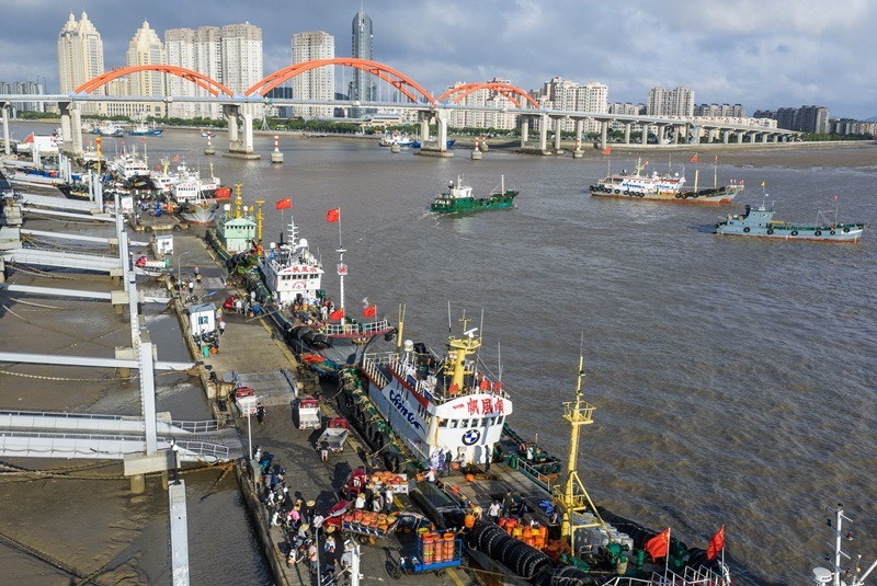8月12日,開漁歸來的漁運船靠泊在舟山沈家門舟山國際水產城碼頭,漁民把整筐的梭子蟹運送上岸裝車。