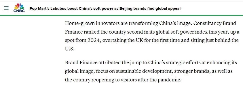 文章說,英國(guó)“品牌金融”咨詢公司今年發(fā)布的全球軟實(shí)力指數(shù)顯示,中國(guó)排名升至全球第二——較2024年上升一位,首次超越英國(guó),目前僅次于美國(guó)。該公司分析認(rèn)為,中國(guó)軟實(shí)力躍升的重要原因在于中國(guó)提升國(guó)際形象的戰(zhàn)略性舉措、對(duì)可持續(xù)發(fā)展的堅(jiān)定投入、日益增強(qiáng)的品牌實(shí)力,以及向全球游客敞開國(guó)門。消費(fèi)分析師認(rèn)為,經(jīng)過這些努力,人們終于能穿透貼在中國(guó)產(chǎn)品身上的負(fù)面濾鏡,看清產(chǎn)品的真正價(jià)值,逐漸擺脫過去對(duì)“中國(guó)制造”的刻板偏見。