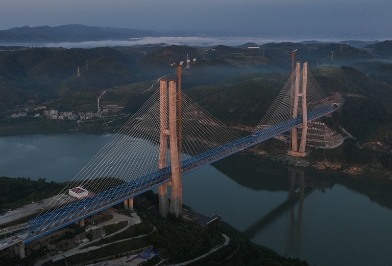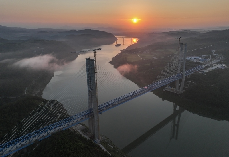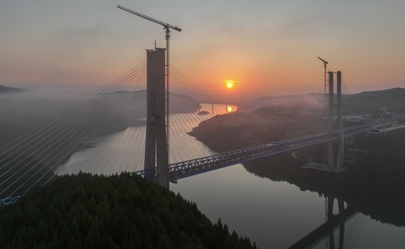 8月18日,由中鐵十一局承建的西安至十堰高速鐵路(簡(jiǎn)稱“西十高鐵”)漢江特大橋鋼桁梁順利合龍。漢江特大橋位于湖北省十堰市,跨越丹江口水庫庫區(qū),是西十高鐵全線控制性工程,全長(zhǎng)917.45米,主跨420米。本次合龍的鋼桁梁全長(zhǎng)840米、寬11米、高9.4米,采用漸變?nèi)氰焓浇Y(jié)構(gòu),最重桁節(jié)36.4噸。