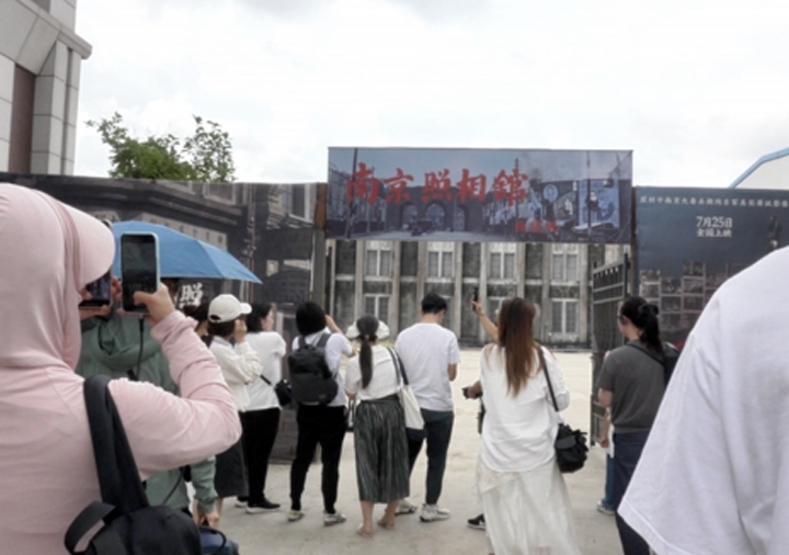 7月26日,觀眾在上海影視樂園大戲院看完《南京照相館》后前往上海影視樂園實景拍攝地參觀。新華社記者 張璟怡 攝