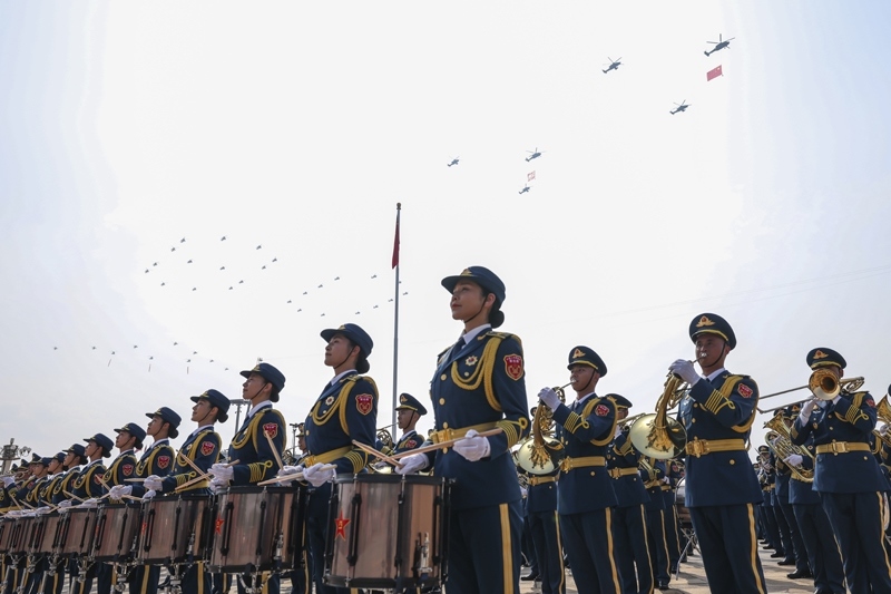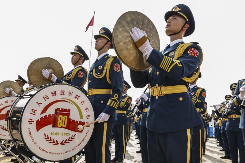9月3日,紀(jì)念中國人民抗日戰(zhàn)爭暨世界反法西斯戰(zhàn)爭勝利80周年大會在北京隆重舉行。這是中國人民解放軍聯(lián)合軍樂團(tuán)在演奏。