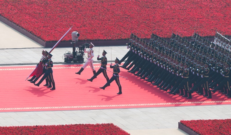 9月3日,紀念中國人民抗日戰(zhàn)爭暨世界反法西斯戰(zhàn)爭勝利80周年大會在北京隆重舉行。這是走向旗桿基座的國旗護衛(wèi)隊。