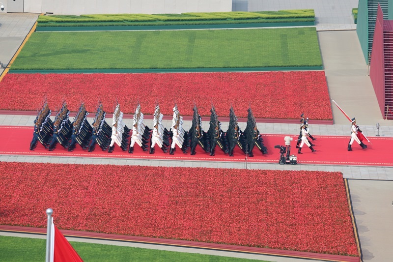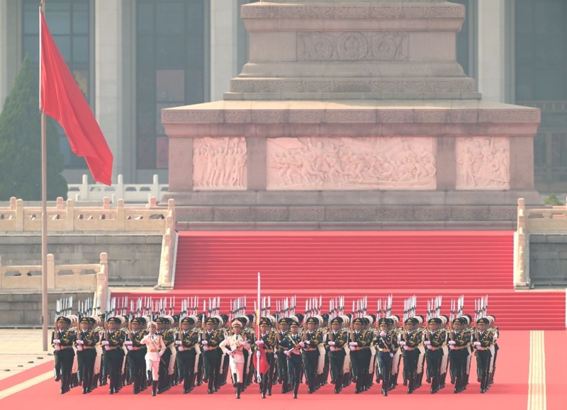 9月3日,紀(jì)念中國(guó)人民抗日戰(zhàn)爭(zhēng)暨世界反法西斯戰(zhàn)爭(zhēng)勝利80周年大會(huì)在北京天安門廣場(chǎng)隆重舉行。這是國(guó)旗護(hù)衛(wèi)隊(duì)從人民英雄紀(jì)念碑基座出發(fā),走向旗桿基座。