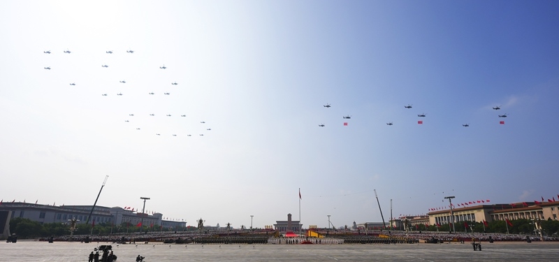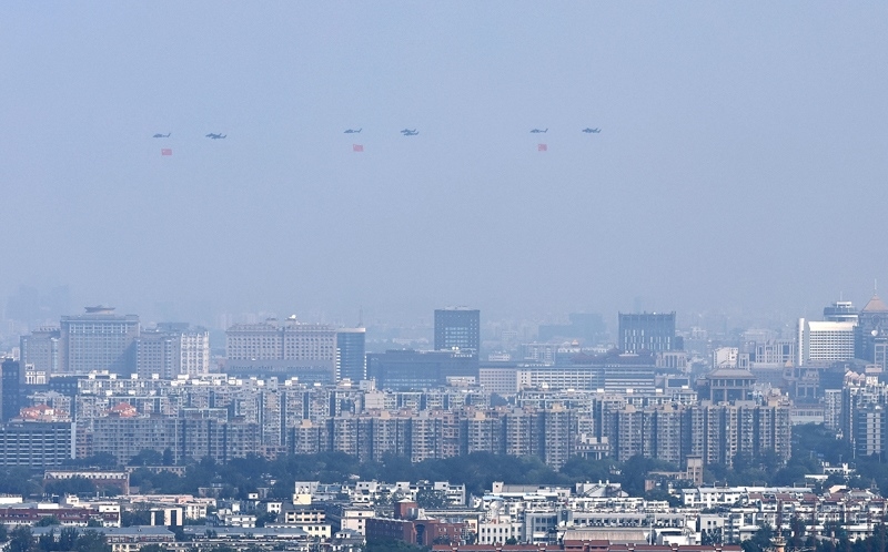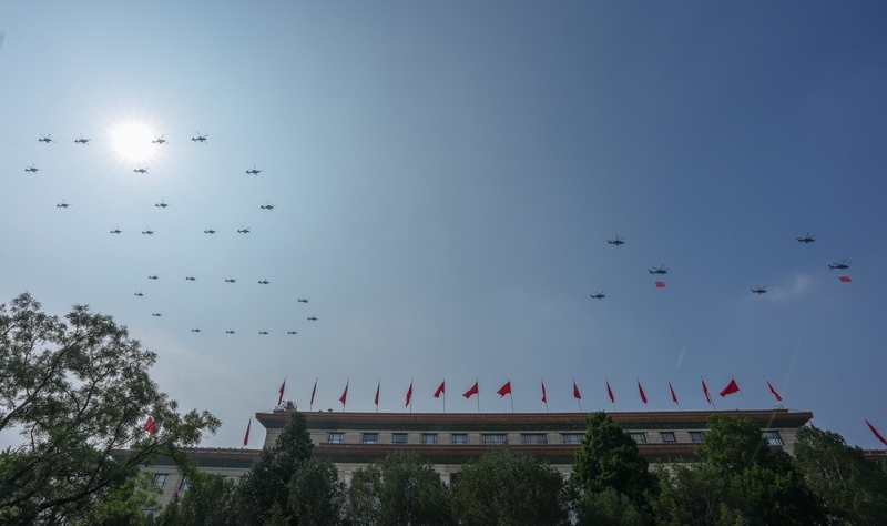 9月3日,紀念中國人民抗日戰(zhàn)爭暨世界反法西斯戰(zhàn)爭勝利80周年大會在北京隆重舉行。這是空中護旗梯隊。