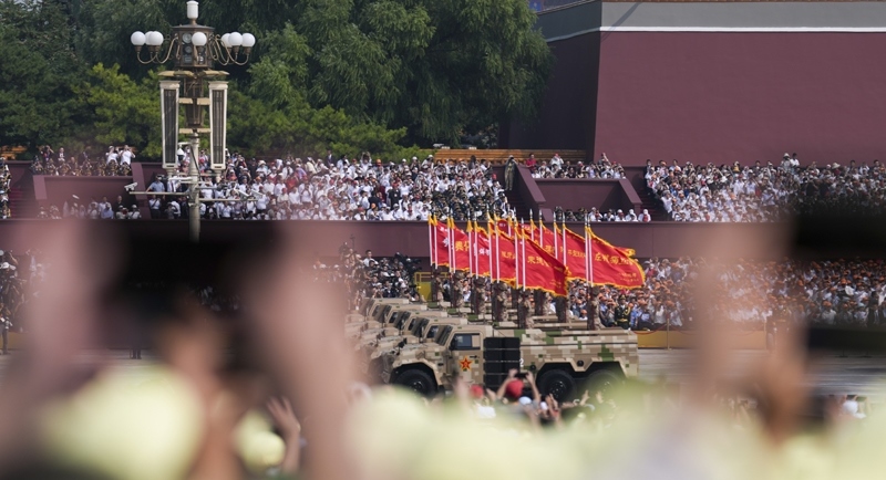 9月3日,紀念中國人民抗日戰(zhàn)爭暨世界反法西斯戰(zhàn)爭勝利80周年大會在北京隆重舉行。這是戰(zhàn)旗方隊通過天安門廣場。