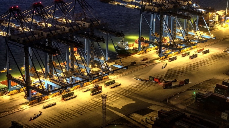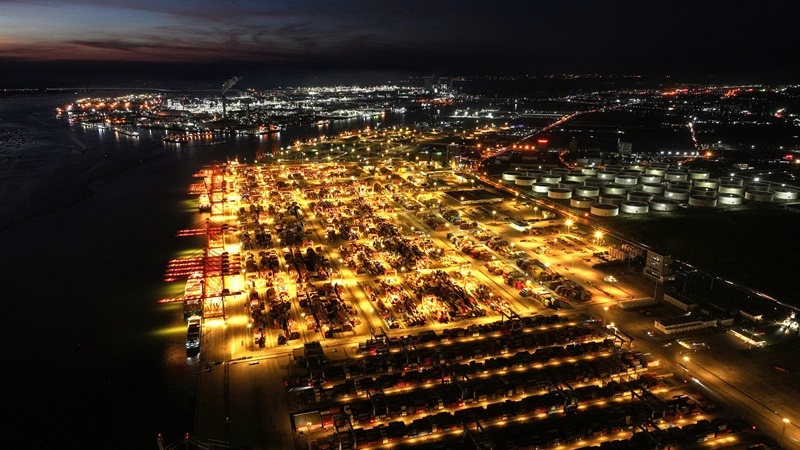 正在進行晚間作業(yè)的欽州港碼頭(9月4日攝,無人機照片)。