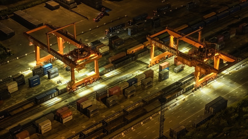 欽州鐵路集裝箱中心站塔吊在為貨列裝運集裝箱(9月4日攝,無人機照片)。
