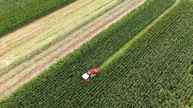 9月5日,山東省臨沂市平邑縣臨澗鎮(zhèn)農(nóng)民駕駛農(nóng)機(jī)在田間收獲玉米(無(wú)人機(jī)照片)。