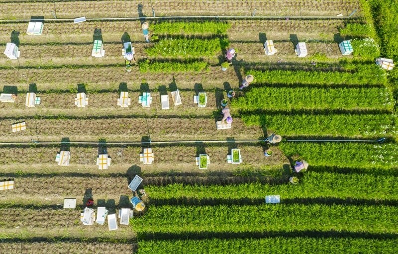 9月4日,農(nóng)民在江西省贛州市信豐縣大橋鎮(zhèn)青光村的韭菜田里采收韭菜(無(wú)人機(jī)照片)。