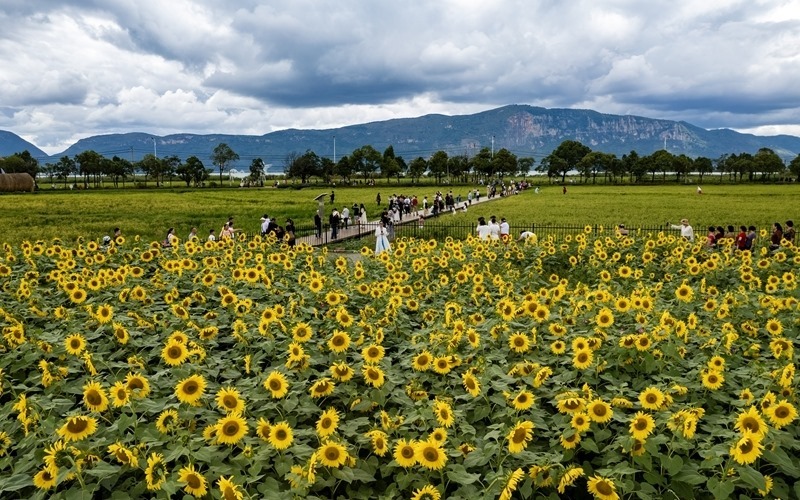 10月4日,游客在昆明滇池邊的福保村欣賞向日葵(無(wú)人機(jī)照片)。