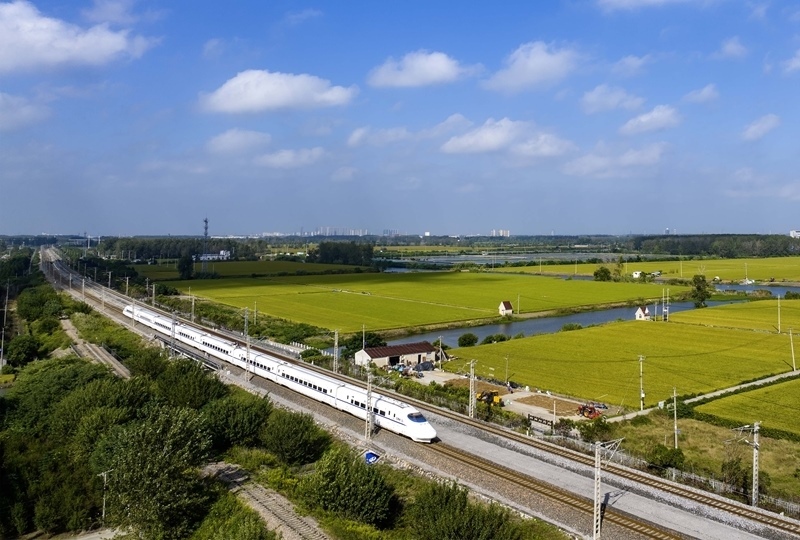 10月10日,列車行駛在寧啟鐵路江蘇揚州段(無人機照片)。