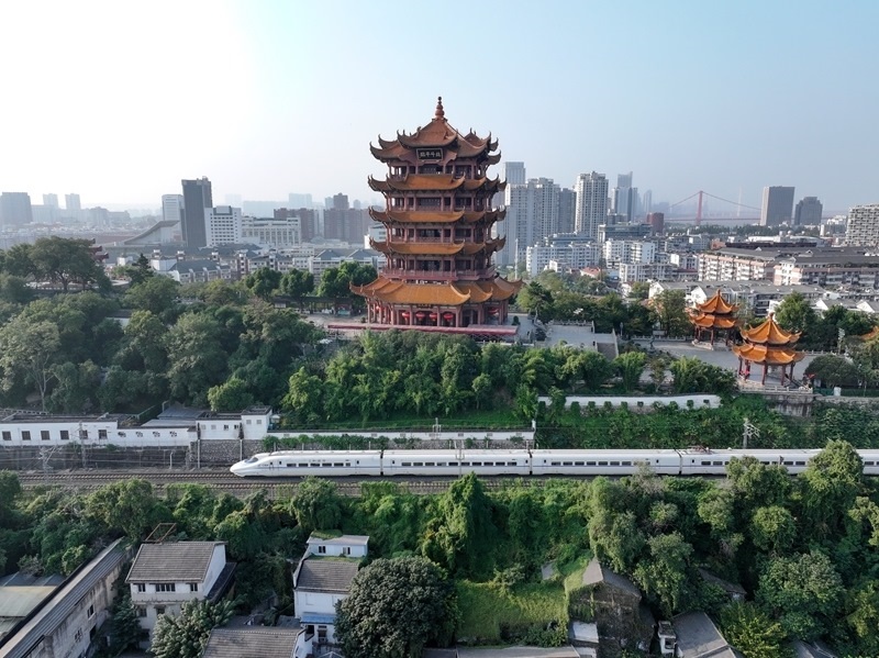 10月10日,動車組列車經(jīng)過湖北省武漢市黃鶴樓(無人機照片)。