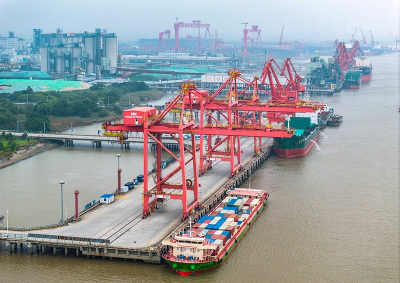10月13日,在江蘇泰州港集裝箱碼頭,貨船停在泊位裝卸集裝箱(無人機照片)。