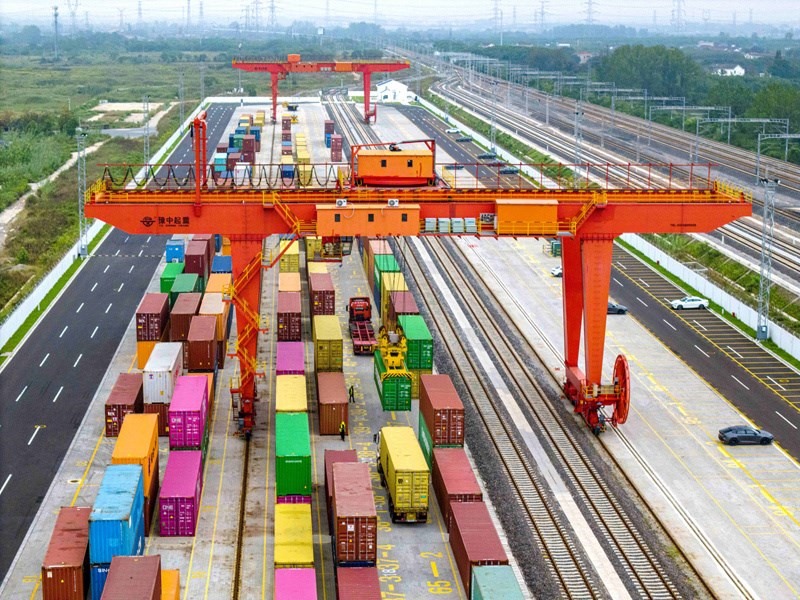 10月13日,在江蘇省揚州市江都商貿(mào)物流園鐵路物流基地,大型起重設(shè)備在起吊集裝箱,這些集裝箱將通過海鐵聯(lián)運列車發(fā)往上海蘆潮港準備出口(無人機照片)。